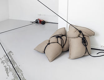 This is an installation witch in practice demonstrate the doctrine of Work = force x distance. The power transmission increase with pulleys, and there is possible to do heavy lifts. To use a longer rope for pull or lift, doesn’t matter anymore. Sacks of sand are lifted, dragged, and hanging in the gallery space. Each sack is bound together with the tying technique “shibari”, which make the sacks with sand, stabile. As a consequence of using the shibari technique, the sacks appear as human or body like and appear as estranged like the phenomena “Uncanny Wally”. The title “May you live in interesting times” are known as a Chinese word of wisdom, with no specific origin, and are supposed to performed as a curse.